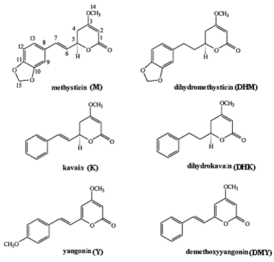 六种主要卡瓦内酯的分子结构