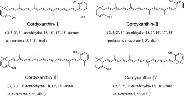 在武汉植物园药用植物资源学科组王庆研究员和比较功能基因组学学科组王瑛研究员的指导下,董静洲博士后从北虫草(Cordyceps militaris)子实体中分离出了四种水溶性黄色素,并经过鉴定命名为北虫草黄素(Cordyxanthins,Ⅰ,Ⅱ,Ⅲ,Ⅳ)。该北虫草黄素与传统类胡萝卜素相比,含有相对较多的羟基和较少的甲基,为水溶性很强的一类色素,而且脂溶性极弱;是迄今发现的唯一一种稀有的水溶性类胡萝卜素,与传统类胡萝卜素相比理论上具有更强的潜在生理活性。该学科组还研究了该北虫草黄素高产新技术,相关研究结果发表在国际学术期刊Journal of Functional Foods上,该北虫草黄素刚发表就引起天然产物与食品科学界的广泛关注,美国科技媒体vertical news报道了该研究发现,2013年第二届食品科学国际会议(BIT's 2nd Annual World Congress of Food S&T-2013)邀请董静洲博士到会做了相关研究学术报告。目前该学科组在进一步研究北虫草黄素的各项生物活性。