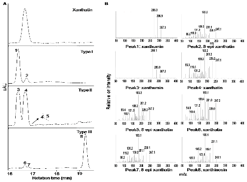 中国科学院武汉植物园天然药物生物合成学科组科研人员陈方方和李长福在章焰生研究员的指导下,采集湖北、安徽、湖南、江西、浙江、四川、甘肃、河南、贵州、山东和北京等11个省市的19个地区的苍耳样品,通过电镜扫描和色谱质谱等手段研究发现苍耳倍半萜内酯在幼叶表面的球状腺毛中大量合成和储藏的,并对这19个地区的苍耳素的提取物进行收集纯化和核磁共振研究,发现在不同生境中的苍耳倍半萜内酯具有化学结构多样性,大致可分为三种:湖北(武汉、浠水、房县)、河南南阳、安徽(合肥、郎溪)、湖南怀化、江西赣州、浙江沥水、四川(遂宁、广源、青城)、贵州王谟、山东泰安和北京的被分第一种类型,腺毛细胞中含有苍耳明(Xanthiumin)和8位异构体苍耳素(8-epi-xanthatin);甘肃庆阳和河南三门峡的为第二种类型,腺毛细胞中含有苍耳明(Xanthiumin)、苍耳素(Xanthatin)和8位异构体苍耳素(8-epi-xanthatin);贵州遵义的为第三种类型,腺毛细胞中含有苍耳素(Xanthatin)、8位异构体苍耳素(8-epi-xanthatin)和二氢苍耳素(Xanthinosin)。从这些区别中可知不同生境中苍耳腺毛细胞中的苍耳倍半萜化合物的次生代谢途径有一定的差别,有关于这方面的进一步研究在进行中。