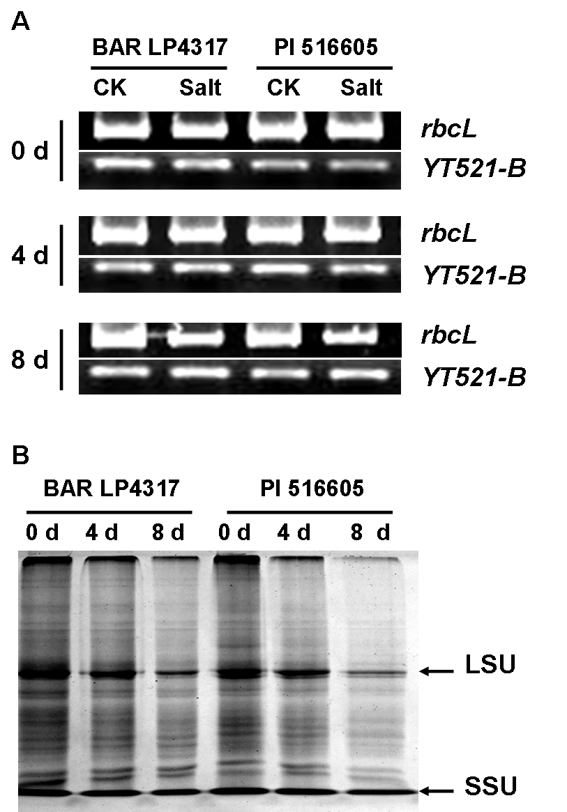 Rubisco酶基因(A)和蛋白(B)在不同耐盐性多年生黑麦草中差异表达(Journal of the American Society for Horticultural Science)