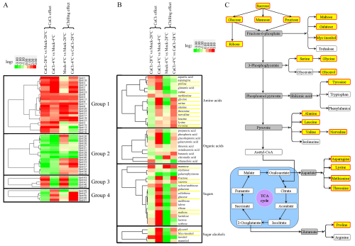 图1 钙在正常和冷胁迫处理条件下调控的差异蛋白(A)和代谢物(B)的聚类分析及部分差异代谢物的代谢途径分析(C)
