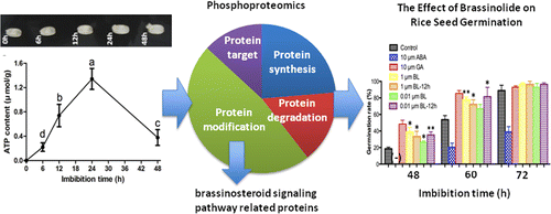 中国科学院武汉植物园资源植物繁殖生物学课题组博士研究生韩超在杨平仿研究员指导下,通过与日本国立作物研究所小松节子(Setsuko Komatsu)教授研究团队合作,利用阳离子亲和层析和非标记NanoLC-MS/MS质谱定量技术对水稻种子萌发早期阶段胚组织的磷酸化蛋白组进行系统研究,发现了油菜素内酯信号通路相应元件的磷酸化水平显著变化,并利用外源施加油菜素内酯的方法确认其在水稻种子萌发早期对萌发有明显的促进作用。