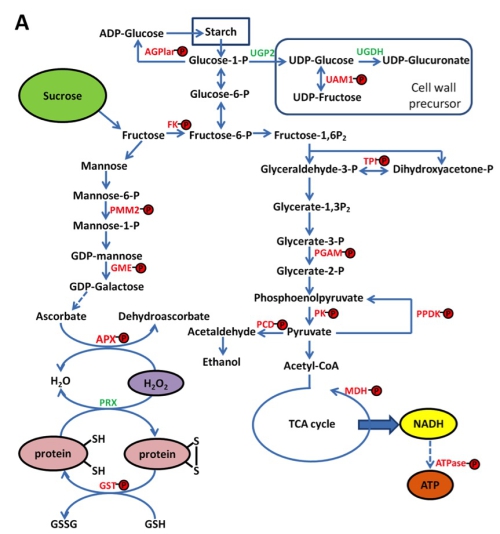 水稻种子萌发过程胚组织磷酸化调控代谢图(红字表示磷酸化水平变化蛋白,绿色字表示稳定磷酸化蛋白)