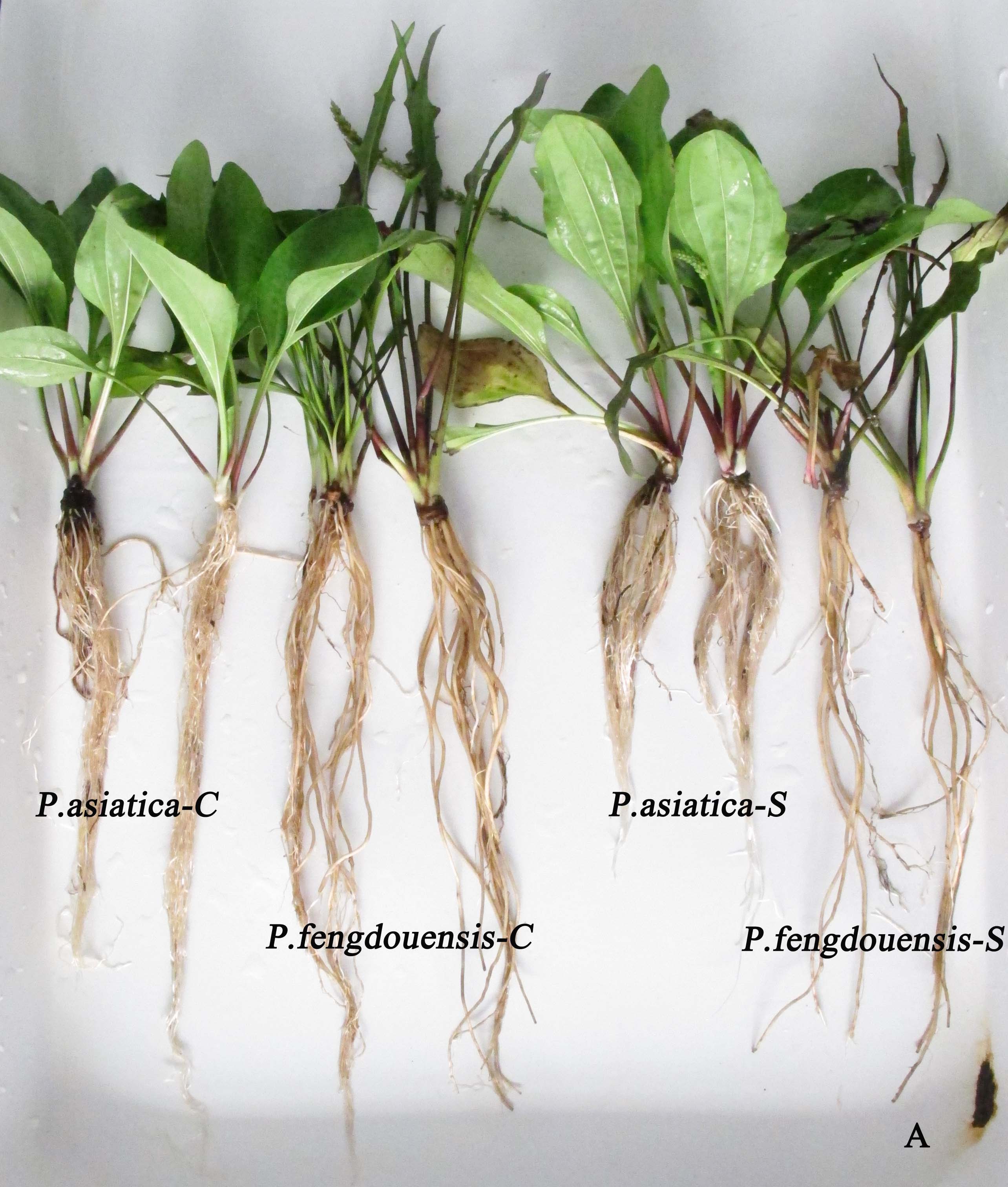 丰都车前的根数目较少,但较为粗壮;而普通车前的根数目较多,但较为纤细。丰都车前的根受水淹胁迫的抑制较小,而普通车前的根系生长受到水淹胁迫明显抑制。