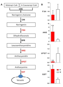 通过对莲红色和白色两种花色的花瓣进行比较蛋白质组学研究,发现在88种蛋白质的表达量在两种花色的花瓣中显著差异表达。通过对差异表达的蛋白质进行功能分类发现,4种参与花青素合成的酶包括黄酮-3-羟基化酶、花青素合酶、花青素-3-O-葡萄糖转移酶和谷胱甘肽转移酶被鉴定。通过进一步分析这4个酶在两种花瓣的基因表达水平,推测花青素合酶可能是导致花青素在莲花瓣中合成和积累的关键基因。另外发现在两种花色的花瓣中花青素合酶基因启动子区域甲基化程度存在显著不同,推测该基因通过控制启动子区域甲基化水平调节其在花青素合成途径中的功能。相关研究结果已整理成文,并发表在Plant and Cell Physiology 杂志。