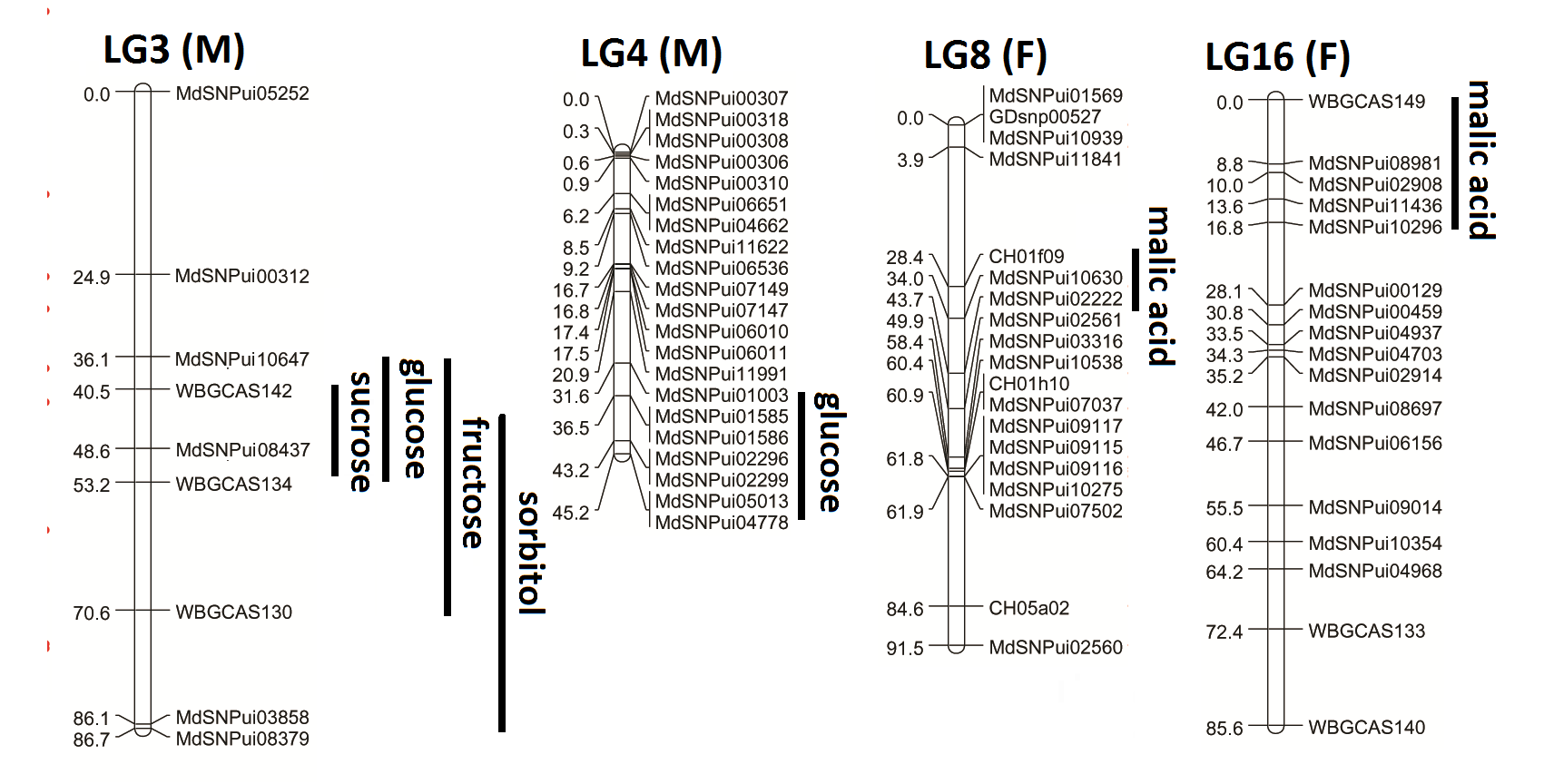 苹果中可溶性糖和有机酸的含量是决定果实口感品质的重要因素之一,武汉植物园果树分子育种学学科组马百全博士在韩月彭研究员的指导下,成功构建‘鸡冠’与‘望山红’杂交群体的高密度遗传连锁图,并对控制苹果中可溶性糖及有机酸含量QTL位点进行定位。研究发现:苹果第3号连锁群上存在一个控制苹果中可溶性糖组分(果糖、蔗糖、葡萄糖及山梨醇)含量的QTL簇(QTL Cluster),并且在4号连锁群上存在着一个单独控制果实中葡萄糖含量的QTL位点。除此之外,在苹果8号与16号连锁群上分别存在着控制果实中苹果酸含量的QTL位点。该研究不仅增强了对苹果中控制果实口感品质的遗传机制的理解,而且为苹果中控制糖酸含量的分子标记辅助育种研究提供有意义的筛选标记。