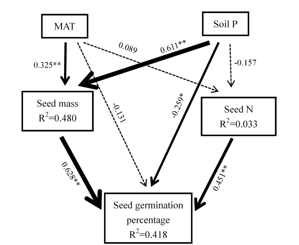 中科院武汉植物园植被生态学科组博士生吴浩和孟红杰,在江明喜研究员和魏新增副研究员的指导下,以第三纪孑遗木本植物领春木为研究对象,研究其在中国分布区内的叶片和种子性状。发现地理梯度上,温度是叶片性状变异的主要驱动因子,而年均温和土壤磷含量是种子性状变异的主要驱动因子。种子重量和种子氮含量对种子萌发率具有显著的正效应,且种子内在属性对种子萌发的影响大于母本环境。