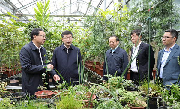 阴和俊首先调研了武汉植物园磨山园区,了解园区物种保育、科普开放和资源保护等方面的工作进展。在猕猴桃国家种质资源圃,钟彩虹研究员汇报了猕猴桃种质资源、关键技术研发与科技扶贫等方面的成果。在光谷园区,阴和俊调研了科研温室和园史展厅,了解了武汉植物园的发展历程、多年来科研合作成果及中国科学院中-非联合研究中心对非科研合作及人才培养等情况。