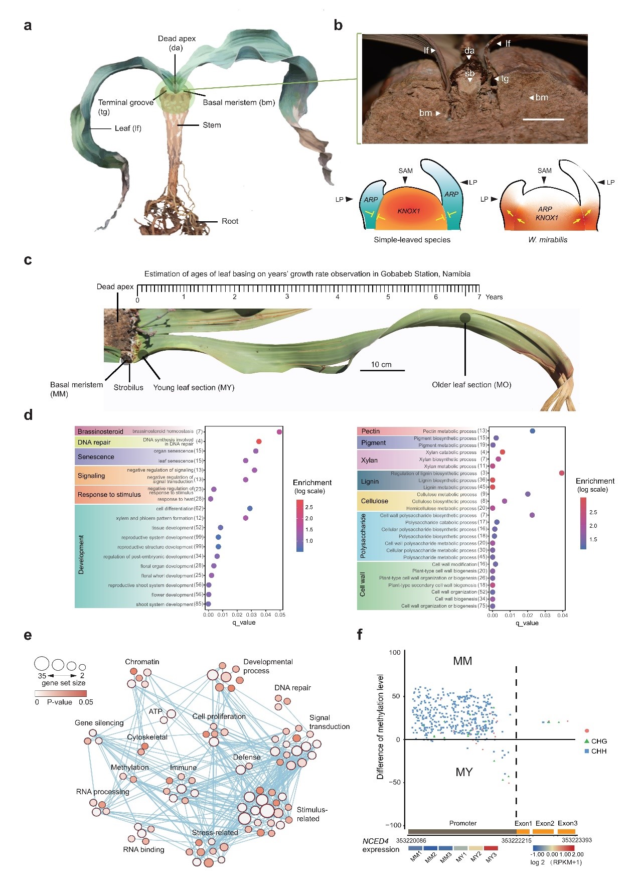 通过与其他代表性陆地植物的比较分析,相关抗性基因(HSP, LRR, WRKY, bHLH等)在百岁兰中发生了明显扩增,涉及细胞稳态、细胞生长速率、DNA修复的诸多转录因子的表达式样,尤其是调控植物分生组织分生能力的ARP和KNOX1共表达模式与其他种子植物区别明显,使得百岁兰能持续不断的获得新分化的叶片细胞,保证两片叶子的持续伸长。研究还发现脱落酸ABA合成限速酶NCED4在百岁兰不同组织差异表达可能是由启动子区CHH差异甲基化调控引起的。