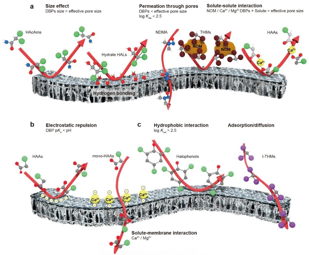 纳滤/反渗透截留消毒副产物主要通过尺寸效应(又称尺寸排阻或空间位阻)、静电排斥以及溶质-溶质/膜相互作用实现。