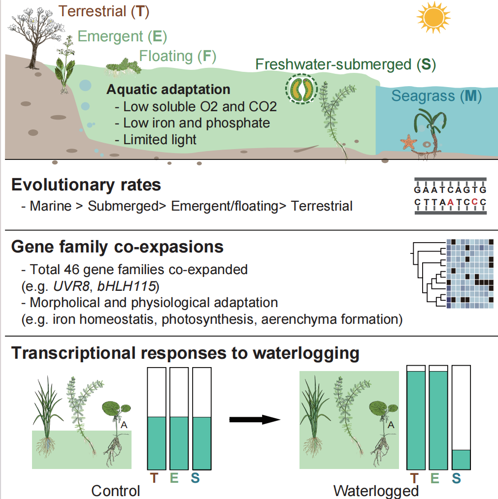 水生植物是长期适应水环境生长的特殊演化类群,在食物、药材供给(如莲藕、芡实)、工业原料(如芦苇)、景观旅游和生态修复等方面发挥着重要作用。尽管生命海洋起源说广为人知,但绝大多数水生植物实际上是由陆生植物重新适应水环境演化而来,这一过程在进化史上至少独立发生了200余次。水生植物如何成功从陆生祖先“移民”至水下世界,一直是植物适应性进化研究领域的热点科学问题之一。