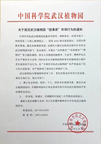 中科院武汉植物园是集科学研究、物种保存、科普开放于一体的国家三大核心植物园之一,国家AAAA级风景旅游区,全国科普教育基地。通过实地调查发现,近期有大量社会机构及组织在未经过武汉植物园同意下,私自组织、开展以“自然教育”“科普教育”“博物学”等主题的课程,部分人员教授的植物学、生态学、博物学知识存在严重的非专业性,同时还存在对植物园物种保育的植物进行破坏甚至盗损的不良行为,给“中国科学院武汉植物园”的声誉造成了较大的负面影响,并严重影响了园内的日常维护工作。