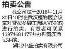 我公司定于2018年11月30日10时在武汉植物园会议室对普拉多牌车(鄂AV5285)进行拍卖,有意者可联系13971681177并办理竞买登记手续。