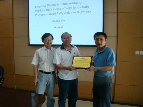 会上,吴国海博士作了题为“Stepwise Metabolic Engineering to Produce High Yields of Very-long-chain Polyunsaturated Fatty Acids in B. juncea”的学术报告。吴国海博士研究小组通过逐步代谢工程法进行转基因植物合成超长链多不饱和脂肪酸(VLCPUFA)的探索,通过五步转基因操作,将来自真菌、鱼、藻类和金盏菊等基因组中与VLCPUFAs(花生四烯酸AA、二十碳五烯酸EPA、二十二碳六烯酸DHA等)生物合成相关的去饱和酶和延伸酶等9个基因在芥菜种子中成功地构建了DHA合成通路。吴国海博士还进一步分析了EPA合成DHA过程中存在的瓶颈的主要原因,即外源转入的延伸酶与植物内源性的延伸复合物的协作程度会影响延伸反应的效率。