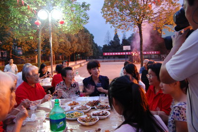 晚上6时,尽管天公不作美看不见月亮,但熊熊的篝火依旧映红了居民喜悦的脸庞。好酒好菜端上了桌,居民们携家带口坐上了酒桌,不分左邻右舍,一同开怀畅叙。