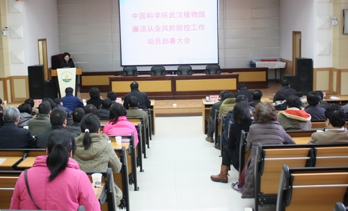 武汉植物园党委副书记、纪委书记龚俊杰从基本概念与概念内涵、总体原则与基本要求、组织领导与职责分工、工作内容与方法步骤及具体工作时间安排五个方面,向广大干部职工解读了“武汉植物园廉洁从业风险防控实施方案”。她指出:开展廉洁从业风险防控工作,主要任务是以完善流程为基础、以防范风险为核心、以加强制度建设为重点,将风险防控的要求“融入”科研和管理制度之中,着力构建科研经费管理、基建项目管理等重点领域各项工作流程规范、权责清晰、风险明确、防控有力、预警及时的廉洁从业风险防控机制。通过3-5年的努力,建立和完善适应科技创新规律、具有武汉植物园特色的覆盖全园的廉洁从业风险防控体系,使武汉植物园廉洁从业风险防控能力明显提升,预防腐败的成效明显提高,在惩防体系中发挥重要作用,促进和推动一流管理,为创新2020提供更加有力的保障。