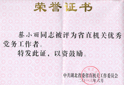 近日,中共湖北省委省直机关工作委员会对2012-2013年度先进基层党组织、优秀共产党员和优秀党务工作者进行了表彰,武汉植物园博士研究生党支部书记蔡小丽同志喜获“省直机关优秀党务工作者”荣誉称号。