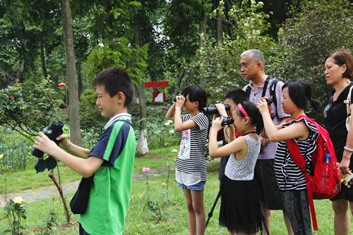 仪式结束以后,省野生动物保护协会的观鸟专家李云飞带领小学生们在武汉植物园园区进行观鸟及讲解,并且向入园游客发放鸟类科普知识的宣传资料。
