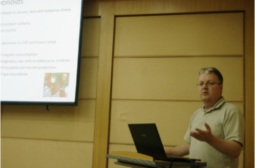 Andrew C. Allan博士作了题为“Unraveling the transcriptional control of polyphenolics in Rosaceous fruits”的学术报告,报告阐述了蔷薇科重要果树中类黄酮-花青素等多酚类物质的合成与调控特性,从花青素含量与其合成途径结构、调控基因的关系,发现UFGT是唯一的表达模式与花青素含量模式完全一致的基因。同时该研究还发现MYB10转录因子能正调控UFGT、DFR和LAR基因,而MYBPA1激活后2者但不能激活UFGT基因的转录;因而推测MYB10和MYBPA1转录因子分别调控花青素和原花青素的积累。报告内容引起到会师生的兴趣并进行了热烈讨论,Andrew C. Allan饶有兴致的回答了植物园师生的提问。