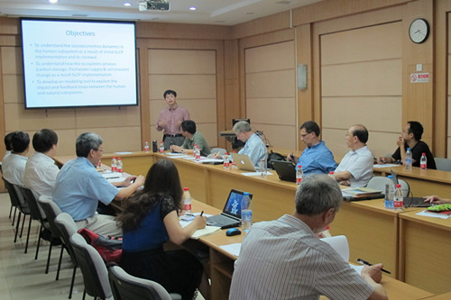 “自然—人类耦合系统”是人类系统与自然系统相互作用而形成的复杂耦合系统。本次研讨会围绕中国的“退耕还林(还草)工程”,探讨此类重大生态工程的对“自然—人类耦合系统”的影响及机制。来自中国科学院生态环境研究中心的傅伯杰院士、国家林业局退耕办周鸿升主任和汪飞跃处长、北卡罗来纳大学Lawrence Band教授、Richard (Dick) Bilsborrow教授、Pamela Jagger博士、美国农业部林务局的Ge Sun博士、国际林业研究中心Nickolas Hogarth博士、北京林业大学的张志强教授、安徽农业大学的徐小牛教授、中国科学院武汉植物园的张克荣博士、国家林业局经济发展研究中心张坤研究员等国内外学者分别作了学术报告。