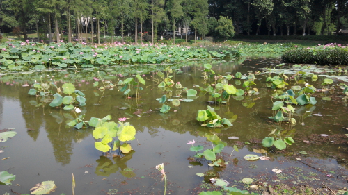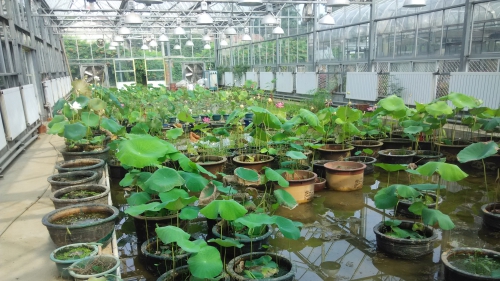 藕种采挖、温室扩繁、夏莲割除、秋荷入池……秋荷的落户充满曲折,也让园地管理水生组的工作人员煞费苦心。高温不足,选择现在生产温室扩繁;为了让秋荷的生长环境更适宜,秋荷移栽之前,工作人员适当地让夏荷为秋荷让道,对部分夏莲进行割除。3月22日,第一批娇嫩的秋荷开始移栽工作,由于高温不足,秋荷存活率较低。4月中旬,工作人员对部分夭折的秋荷进行补充。6月11日,已经是烈日当头的夏季,夏荷已经荷叶田田,工作人员穿厚重不透气的防水服冒着烈日下池进行最后一批秋荷移栽的移栽工作。