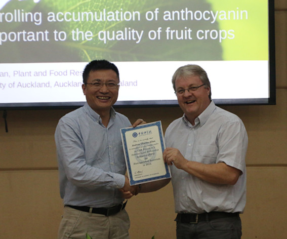 5月4日下午,武汉植物园副主任张全发为Andrew C. Allan颁发了“国际杰出访问学者”荣誉证书。随后,Andrew C. Allan为武汉植物园师生带来了题为“Controlling accumulation of anthocyanin is important to the quality of fruit crops”的精彩学术报告。报告中探讨了苹果、桃和猕猴桃等水果果实中花青素含量性状的成因,以及其所受到的调控因素,为面向应用的育种科研活动提供了理论基础和分子途径。