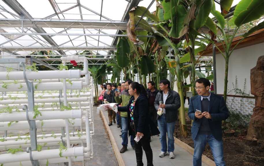 广大党员首先参观了园区的食用菌周年高效生产车间,了解了食用菌从培养基制备到采收包装的工厂化种植流程。车间里机器轰鸣,培养基装瓶、菌种接种、搔菌等环节均由机械手完成,高效且无污染;培菌室和发育室的光、温、湿条件均由电子程序控制,不同环节中的运输过程均由流水线输送, 精确且便捷。听着解说员的讲解,看着眼前繁忙有序的生产过程,大家不断发出啧啧的赞叹,感慨工业化在农业领域的大规模应用,也赞叹农业从传统粗放型向现代集约化的迅猛发展。随后大家参观了现代设施栽培园,了解了墙式栽培、环形栽培、管式栽培、柱式栽培等现代化高科技栽培技术,也学习了设施农业种植技术。