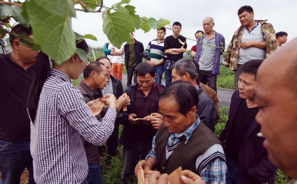 目前,武汉植物园已为湖南花垣的3000亩猕猴桃基地提供了品种支持和技术指导。15日,支部一行前往花垣县道二乡对农户进行猕猴桃疏果、套袋和病虫害防治的田间指导,同时对企业技术人员进行技术培训,强调要加强园区病虫害防治,保证产量,提高品质。