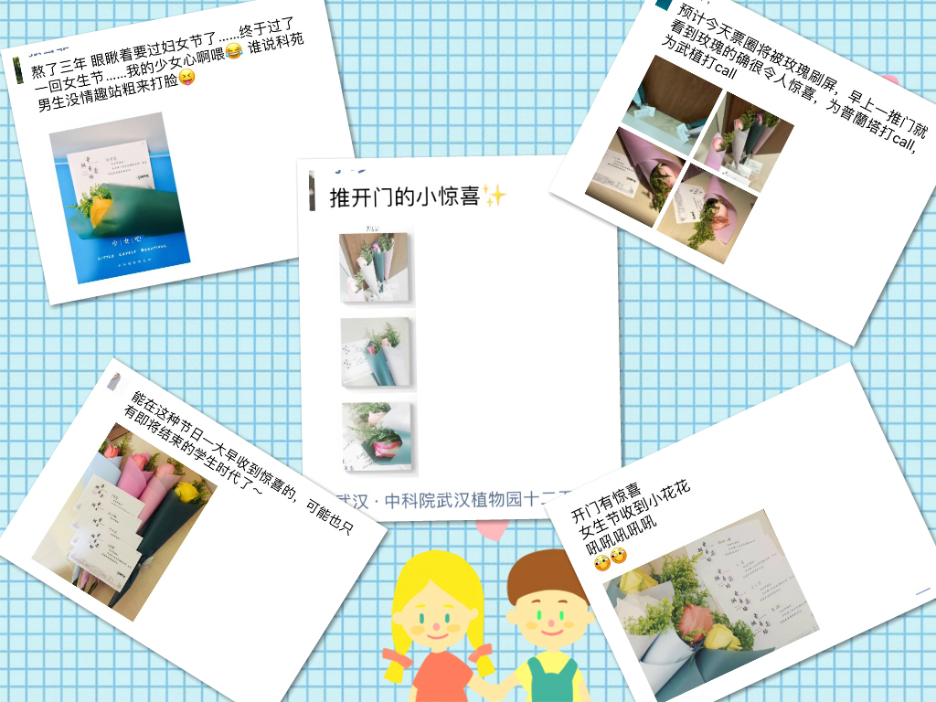 此次活动由武汉植物园研究生会主办。活动前期,研究生会利用武汉植物园风景照为素材精心设计专属明信片,并专门购置鲜切花进行包装制作。3月7日早晨6点,研究生会成员们将制作好的鲜花与明信片礼物逐一放在女生宿舍门口,为每位女生送上节日的祝福。当女生打开宿舍门,看到鲜花与明信片礼物时,纷纷表示很惊喜,收获到了满满的感动。