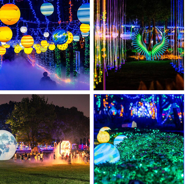 森林秘境中光影交错,行星星球组成“灿烂星河”,各色灯串绚丽夺目,夜晚的武汉植物园如梦似幻、流光溢彩,充满激情与活力。夜游活动区域主要分布在景区入口至沉水植物区再到中心草坪沿线。包含行星梦幻长廊、流动梦境长廊、瑶池仙境区、迷雾森林等8个景点,同时开设了儿童游乐区和国风神话表演区。