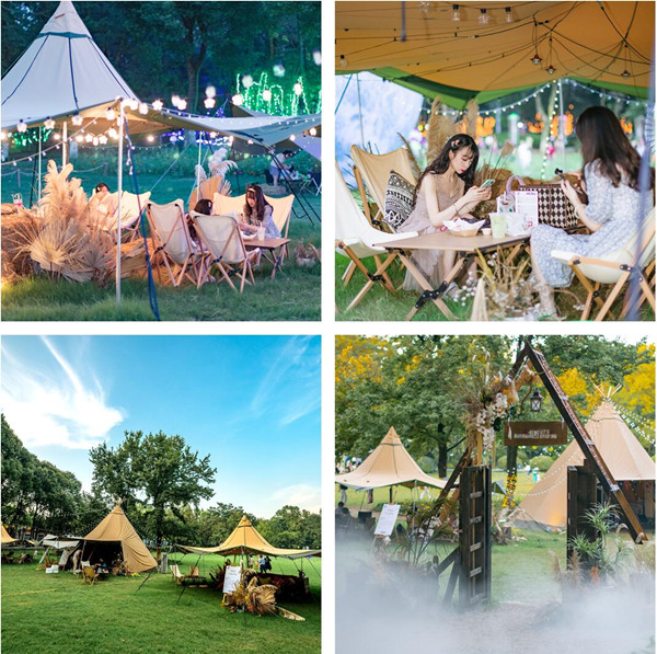 目前营地拥有3个大型尖顶帐篷和4个天幕,可同时容纳80人就坐。营地后期会将露天电影、户外潮流运动、森林音乐会、沉浸式剧游融入营地场景之中,提供多方面的极致文化体验。