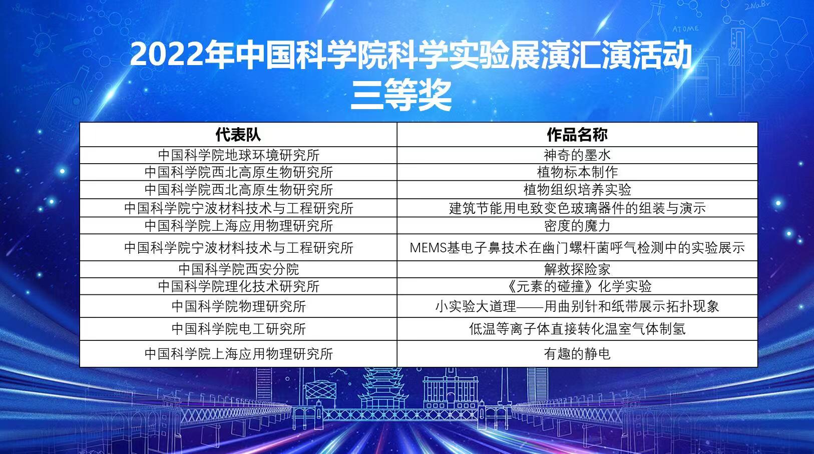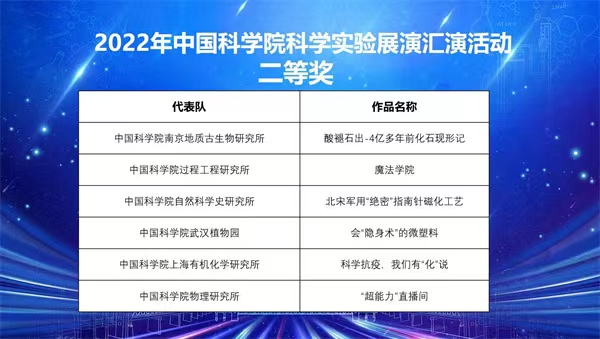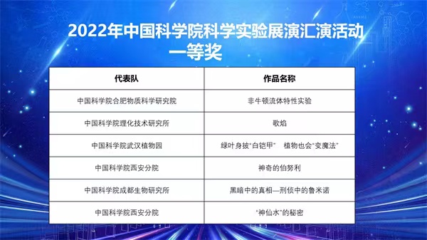 中国科学院国家天文台原党委书记、副台长、研究员刘晓群等七位专家组成专家评委会,评委分别从实验内容、演示效果、整体形象三方面进行评分。经过评审,展演汇演活动最终评出一等奖6名、二等奖6名、三等奖11名。中国科学院合肥物质科学研究院、中国科学院理化技术研究所、中国科学院武汉植物园等参赛队伍荣获一等奖,中国科学院南京地质古生物研究所、中国科学院过程工程研究所、中国科学院自然科学史研究所等荣获二等奖,中国科学院地球环境研究所、中国科学院西北高原生物研究所、中国科学院宁波材料技术与工程研究所等荣获三等奖。