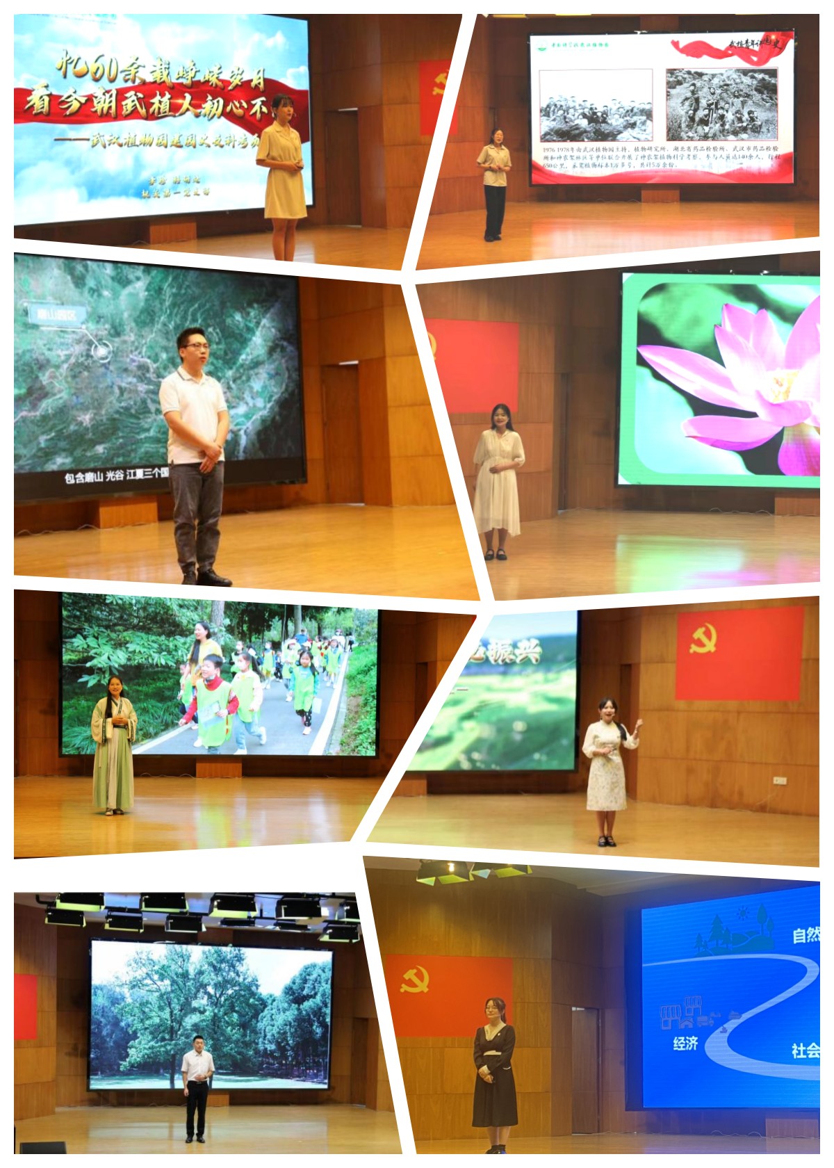 八位宣讲人在短短九十多分钟的时间里,奉献了一场别开生面的邂逅园史展演。从武汉植物园的六十七年建园史,到几代武植人的科考历程,再到参与编撰出版了多本植物志;从伴随武植成长的参天古树的角度,讲述了武汉植物园的历史变迁;从数余年来一直为之努力的南水北调的中线工程,再到到三代人为之奉献的猕猴桃,展现了武汉植物园科研人员的奋斗传承;从开遍九州大地的500多种荷花,再到库区消落区生态重建完整体系,讲述了武汉植物园的点滴成就......观众们深刻感受到了现有美好环境的得来不易,进一步激发了武汉植物园人的荣誉感、使命感、责任感。