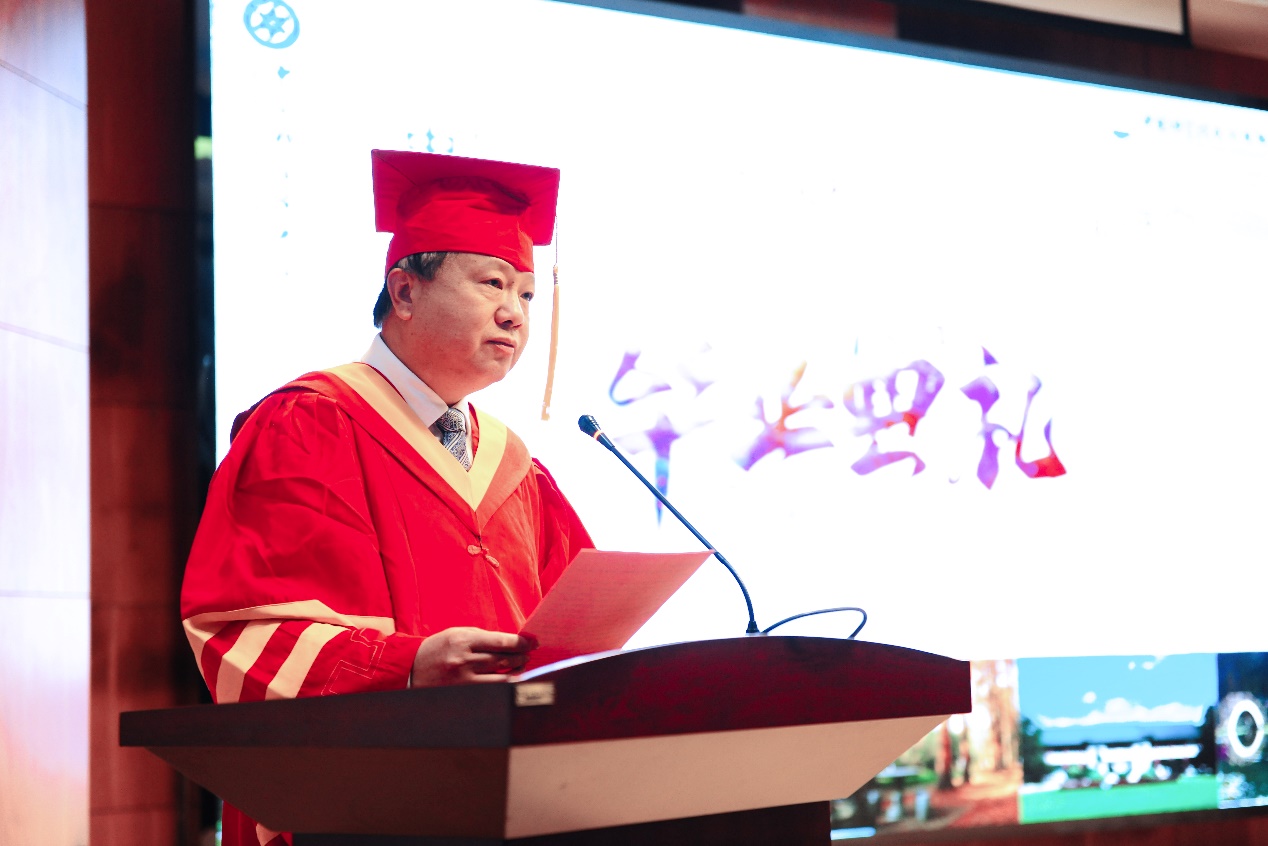 在雄壮激昂的国歌声后,园主任王青锋发表致辞。他代表全体导师、学生和职工,向2024届全体毕业生表示衷心祝贺,向悉心教导和培养研究生的导师们表示崇高敬意。王青锋指出,在宝贵的学习生活中,同学们见证了国家的重大历史时刻,参与了武汉植物园的改革发展,收获了人生中难忘和珍贵的印记。临别之际,他向全体毕业生提出三点寄语:一是希望同学们胸怀家国, 在国之大者中成就小我,争做复兴栋梁、勇当强国先锋;二是希望同学们保持韧性,在不懈奋斗中磨砺意志,用努力与坚持成就自我、开创未来;三是希望同学们坚守初心,在变革迭起中收获成长,用谦逊、乐观、进取的心态去面对生活中的一切悲欢喜乐。最后,王青锋祝愿全体毕业生在未来的岗位上不断释放青春激情、追逐青春梦想,成就宝贵人生。