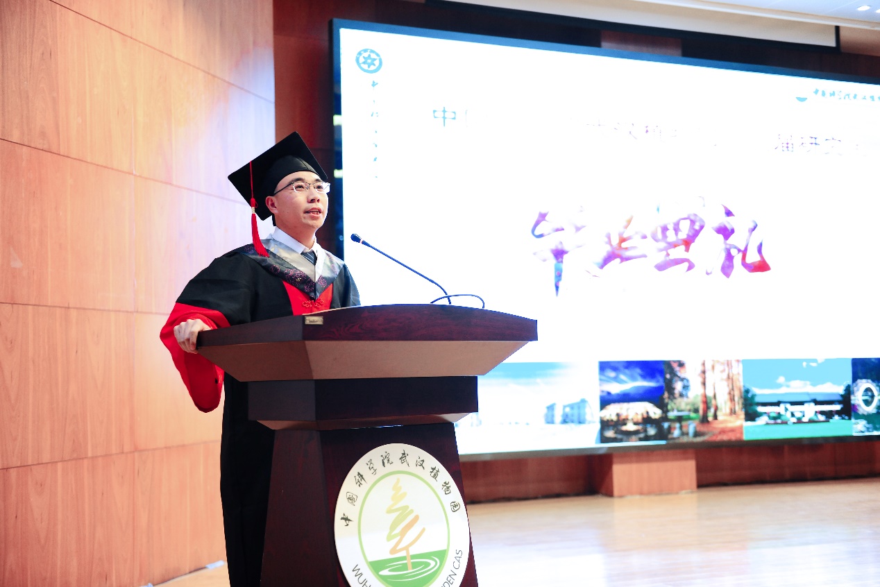 毕业生代表王党军发表题为《爱与成长,致死方休》的毕业感言,表达了对家乡、对祖国的爱,感谢中国科学院和武汉植物园各位老师的精心培养,并祝福所有的毕业生未来身体健康、幸福快乐。他表示经过二十多年的锻炼和科学院的培养,全体毕业生均已具备强健之体魄、独立之精神、批判之思维,未来将会用人性之真善美去面对一切高山低谷。