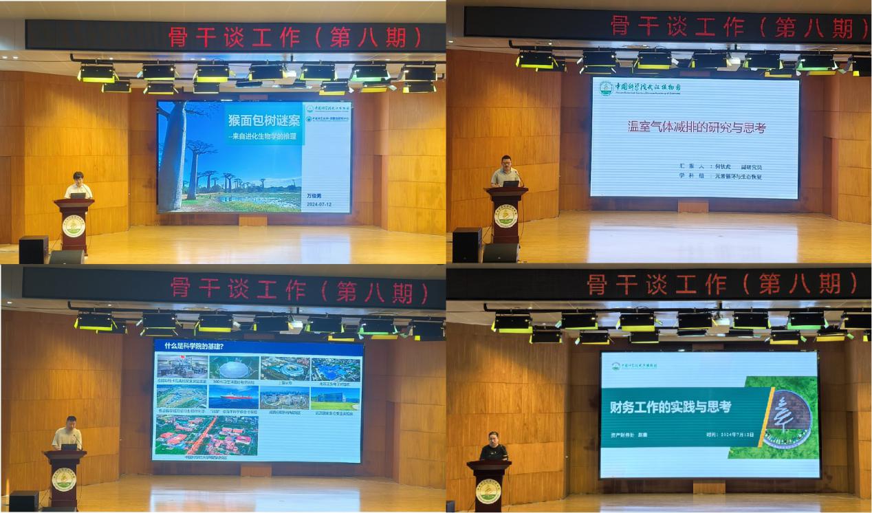 本次活动由植物多样性与进化学科组万俊男、元素循环与生态恢复学科组何铁虎、条件保障处马智明、资产财务处赵鑫四位业务骨干作交流。万俊男介绍了猴面包树属的多样性演化历史,分享了研究过程中的感悟及研究成果成功发表在《自然》杂志的心得体会。何铁虎围绕研究背景和方法介绍了温室气体减排的相关研究工作,从野外工作、论文发表经历等方面分享了自己的感悟。马智明围绕基建工作定义和园基建工作进展,分享了基建工作的实践与感悟。赵鑫围绕财务工作的内容、实践与思考三个方面进行了详细介绍。