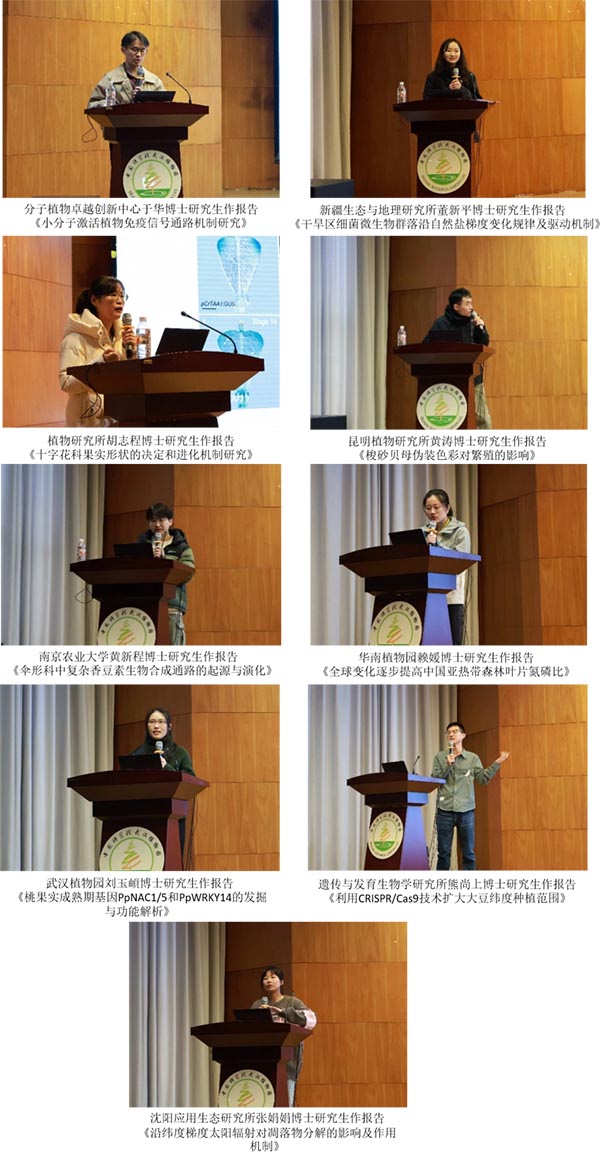 口头报告环节由研究生会主席马月平主持。来自分子植物卓越创新中心、新疆生态与地理研究所、植物研究所、昆明植物研究所、华南植物园、武汉植物园、遗传与发育生物学研究所、沈阳应用生态研究所及南京农业大学的9名博士研究生分享了科研成果,展示了研究的多样性和深度。现场专家评委及参会学生积极提问,学术氛围浓厚。