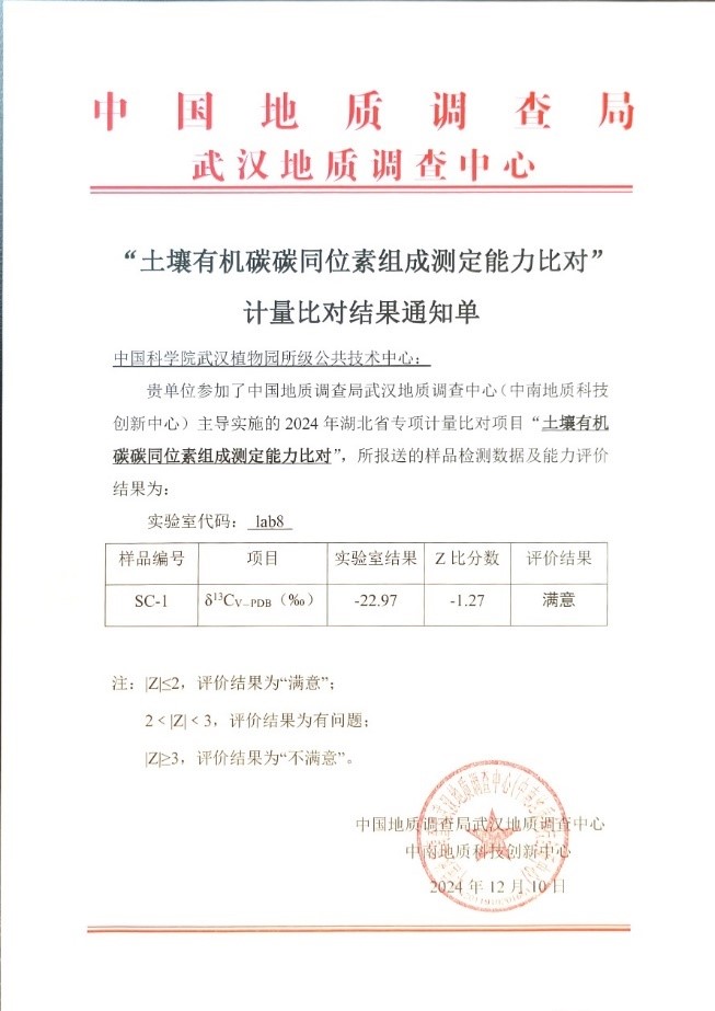 公共实验平台在2024年专项计量比对工作-“土壤有机碳碳同位素组成测定能力”实验室间比对项目中获“满意”结果