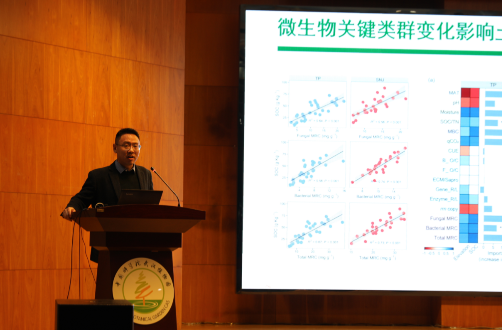 刘玉荣教授以“土地利用变化与土壤生物多样性”为题,系统探讨了全球变化背景下土壤微生物群落及其生态功能的演化机制。他从土壤生物多样性与功能关系、土壤微食物网的响应与适应,以及土壤微生物演变对生态功能的影响等方面进入深入剖析,揭示了土地利用变化对生态系统多样性和功能的影响,为生态保护与可持续发展提供科技支撑。