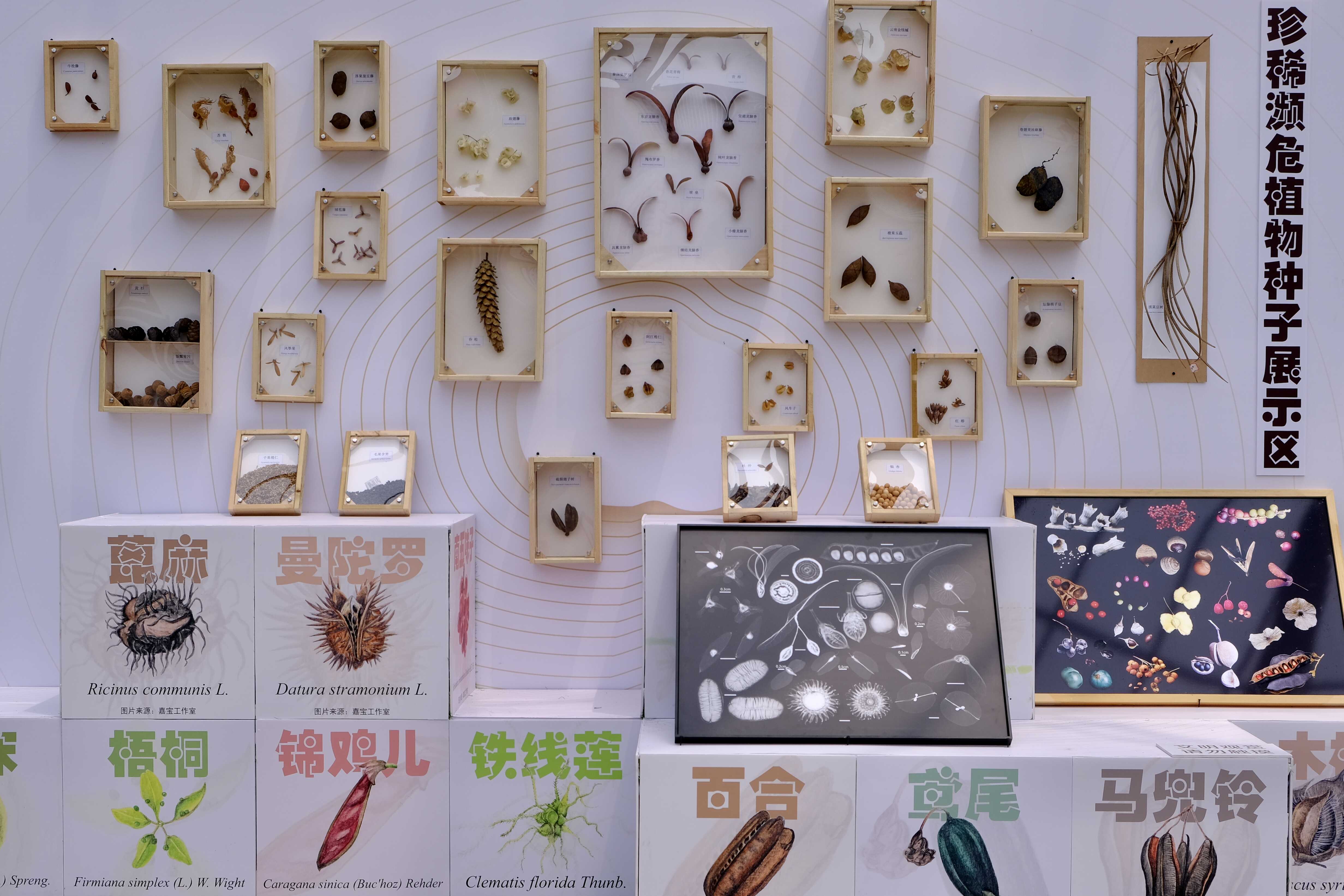 在武汉植物园景观温室门口的展览现场,52种珍稀濒危植物和重要种质资源植物的种子集中亮相。珍稀濒危植物种子区展示了包括国家一、二级重点保护野生植物,中国特有种如坡垒、苏铁、大果人面子、云南金钱槭等植物的种子。重要种质资源植物展区则展示了野大豆、扁桃、野蕉、木油桐等作物近缘种以及特色经济植物的种子,展现其独特的科学利用、经济开发与文化价值。