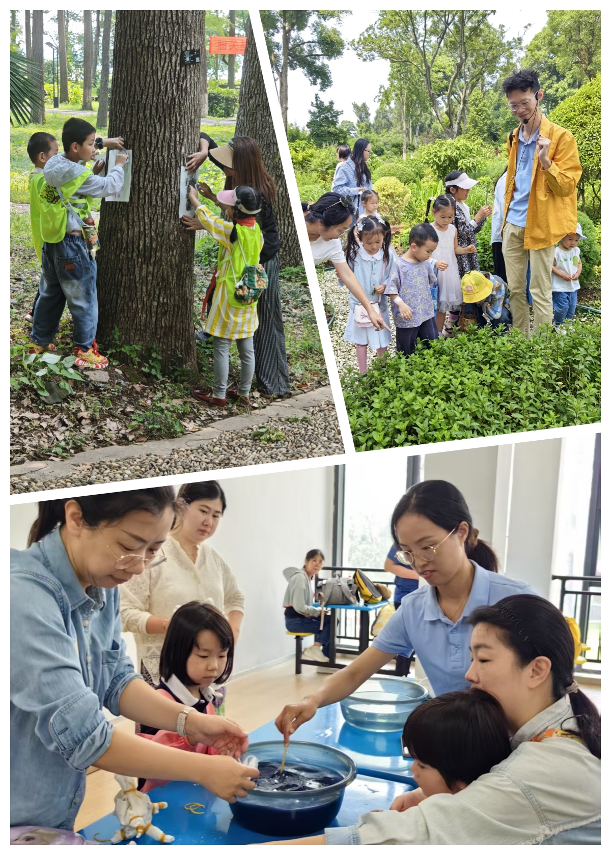 活动以“双轨并行”模式开展:牵着父母手的低龄萌娃们在药园开启芳香探秘之旅,在嗅觉体验中感知植物的奥秘;独立探索的学龄儿童则化身“植物小侦探”,近距离观察珙桐等“植物界大熊猫”。“非遗扎染手提包”活动环节中,孩子们在科普老师的指导下体验扎染工艺,将白布扎结成各种形状,浸入植物染料后展开,呈现出独特的冰裂纹和放射状图案,现场欢呼声不断。最后,大家在老师的带领下,制作了属于自己的树皮拓印画。活动结束时,沾着蓝染的小手、挂着草籽的鞋带都成了“快乐勋章”。孩子们创作的作品既展现出中华传统文化的魅力,又蕴含了科学知识,成为孩子们难忘的“六一”礼物。