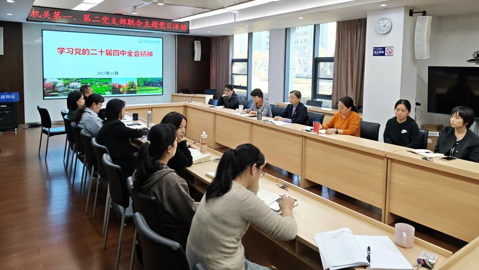 11月13日下午,武汉植物园机关第一、第二党支部联合举办主题党日活动,深入学习贯彻党的二十届四中全会精神。党委书记、副主任尚纳新以普通党员身份参加,活动由机关第一党支部书记陈艳主持。