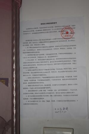 1、研究生赵素婷、张倩按要求将《研究生公寓住宿承诺书》粘贴在公寓内,时刻提醒自己严格遵守公寓的管理规定。