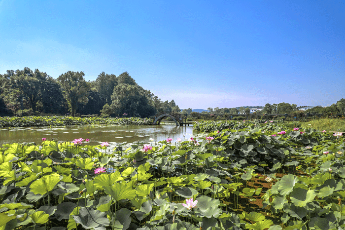 荷花展示区占地面积约16370平方米,收集和栽培荷花品种300余种,其中包括中日友谊莲、太空莲等多个荷花珍品,涵盖藕莲、籽莲、花莲三大类。“池塘一夜秋风冷,吹散芰荷红玉影”,荷花虽美却耐不住秋风寂寥,但在武汉植物园,这里的荷花能从夏美到秋。自2015年开始国际登录认证荷花新品种以来,中科院武汉植物园已有17个荷花新品种获得国际认证,其中大部分属于长花期秋荷品种,引领国际长花期秋荷育种的方向。