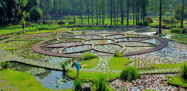 睡莲展示区占地面积约15000平方米,收集和保育世界各地睡莲珍品200余个。这里不仅是五湖四海睡莲珍品的聚集地,也是睡莲种质资源杂交创新的试验平台。这里仿照盛开的睡莲花瓣建造成“八色睡莲池”,从艺术的角度呈现了睡莲的多姿多彩。每个花瓣形的水池内,栽种不同色系睡莲,其中包括印度红睡莲、埃及蓝睡莲、墨西哥黄睡莲、中国延药睡莲等珍奇品种,展示世界各地睡莲姿态,成为园内一道亮丽的风景。这里还有依照莫奈诺曼底花园的方式,在池塘里种植各色睡莲品种,仿佛穿越时空,进入名画世界。
