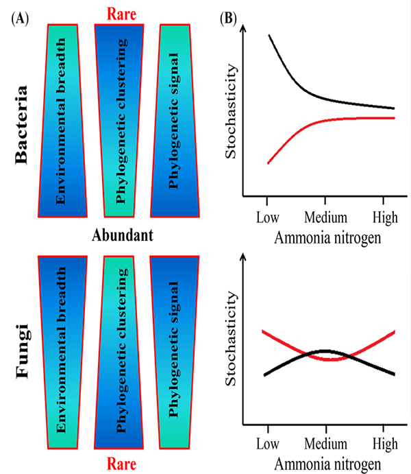 针对青藏高原湿地土壤微生物多样性维持机制的工作。研究发现:细菌和真菌丰富种较稀有种具有更宽泛的环境阈值,更强的系统发育信号,因而环境适应性更强。稀有种群落构建主要受确定性过程主导,而丰富种主要受随机性过程主导。土壤氨氮含量影响随机性与确定性过程的平衡。研究成果发表于Molecular Ecology上。
