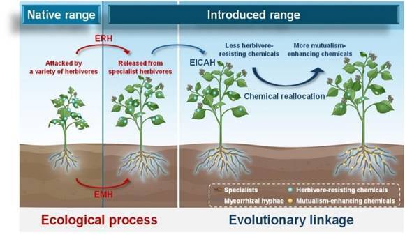 入侵生物有效防控是构建国家生物安全体系的重大战略需求。团队以重大外来入侵植物为研究对象,聚焦“生物入侵对生物多样性的影响和作用机制”和“脆弱生态系统对生物入侵的响应和反馈”。2025年度,团队提出“次生代谢物重分配推动外来植物入侵”新理论 ,阐明继发性入侵的潜在新机制,相关成果发表在 Trends in Ecology & Evolution、PLOS Biology、Soil Biology and Biochemistry 等生态学期刊,研究成果为制定科学防治策略、构建防控技术体系、减轻入侵危害提供重要的理论支撑和实践指导。