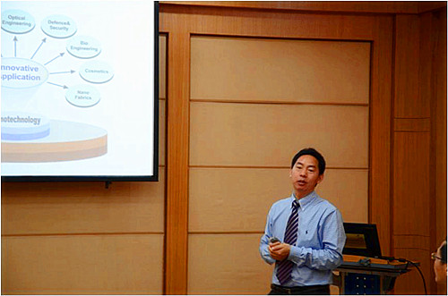 陈国防博士作了题为“Stimuli-Response Polymeric Fragmented Nanotubes for Controlled Drug Delivery in Cancer Treatment”的学术报告。报告中,陈国防主要介绍了新型聚合物纳米管材料在可控的靶向抗癌药物输送中的应用。他们在研究中发现通过加入适当比例的二甲基丙烯酸乙二醇酯(ethylene glycol dimethacrylate, EGDMA)交联剂,利用光引发的聚合反应促使甲基丙烯酸缩水甘油酯(glycidyl methacrylate, GMA)单体形成对温度和pH敏感且外表均一、具有一定机械强度的聚合物纳米管;并利用超声方法以及活化的靶向配体——叶酸对纳米管进行改造和修饰,制备聚合物纳米管主动靶向系统,研究了其生物体外抗癌药物的缓释行为。相关研究成果已经发表在Colloid and Polymer Science, Journal of Nanomaterials, Journal of Materials Chemistry等SCI专业期刊上。