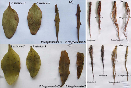 水淹前后两种车前叶片和根中的H2O2(A、B)、O2·?(C、D)的组化分析 (C, 对照; S, 水淹胁迫)