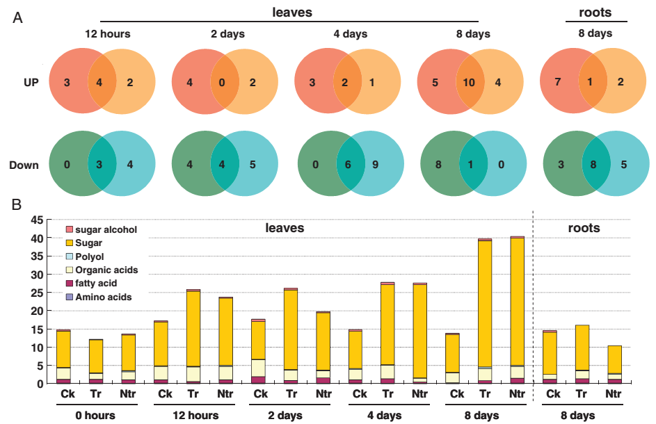 (a)代谢产物在不同处理时间点和组织中的维恩图分析;(b)不同代谢产物在驯化植株 (Tr)和非驯化植株(NTr)差异表现